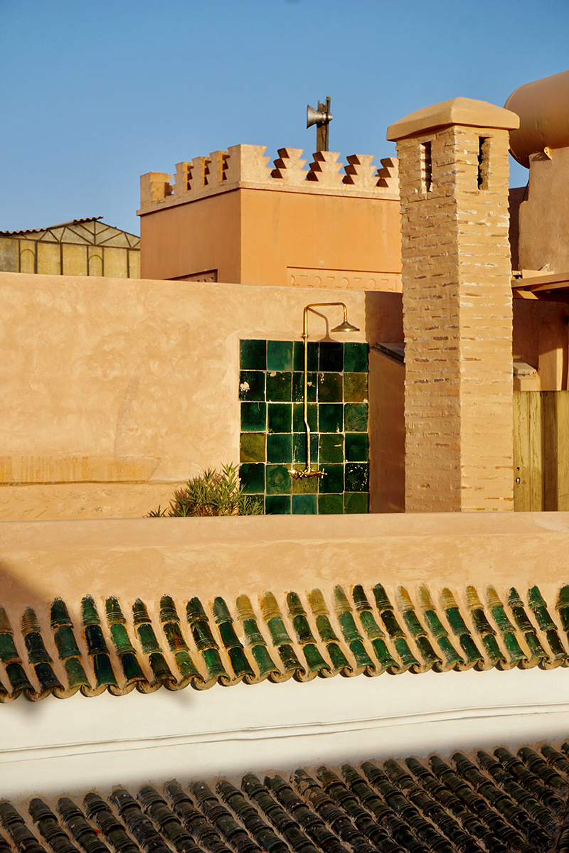 Depuis la terrasse ensoleillée du Riad, le regard embrasse les toits ocre de la Médina, jusqu’aux cimes lointaines et enneigées de l’Atlas, entre un appel à la prière et le parfum des épices. À l’horizon, les montagnes se découpent avec majesté sur le ciel clair, tandis que la silhouette élancée de la Koutoubia domine la ville, baignée par la lumière dorée du matin ou les teintes rosées du crépuscule.